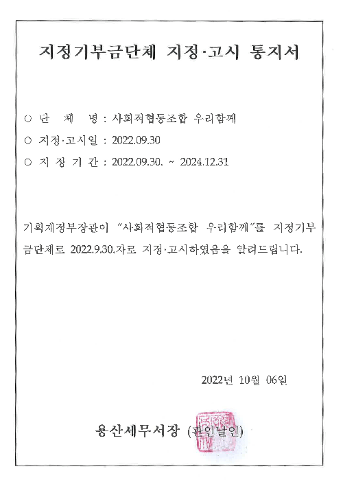 공익법인 지정 고시(기획재정부 고시 제2022-21호) 법인세법 시행령 제39조제1항제1호바목 | 사회적협동조합 우리함께